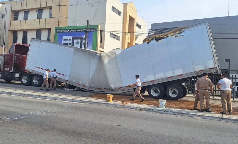Accidente en la avenida Hidalgo de Tampico: caja de tráiler se dobla