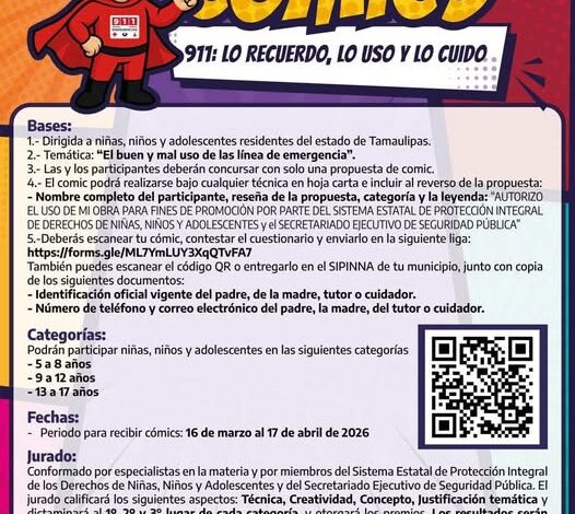Niñas, niños y adolescentes de Tamaulipas podrán participar en el Concurso de Cómic 2026 “911: Lo recuerdo, lo uso y lo cuido”, una iniciativa que busca fomentar el uso responsable de la línea de emergencias a través de la creatividad. La convocatoria está dirigida a personas de entre 5 y 17 años, quienes podrán expresar sus ideas mediante dibujos tipo historieta.