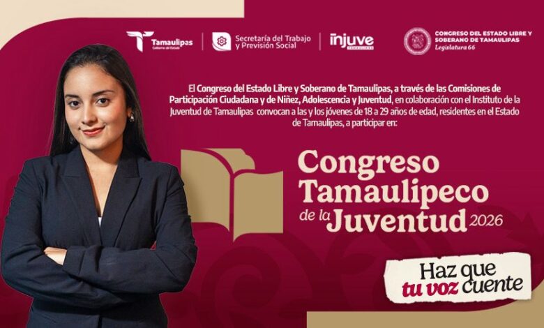 Ciudad Victoria, Tamaulipas.- El Congreso de Tamaulipas, a través de las Comisiones de Participación Ciudadana y de Niñez, Adolescencia y Juventud, en colaboración con el Instituto de la Juventud (INJUVE), anunció formalmente la apertura de la convocatoria para el Congreso Tamaulipeco de la Juventud 2026.