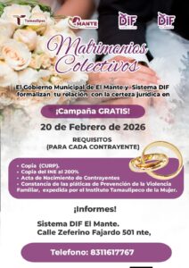 El Gobierno Municipal de El Mante 2024–2027, encabezado por la alcaldesa Patty Chio, a través del DIF El Mante y en coordinación con el DIF Tamaulipas, anunció la realización de la Primera Campaña de Matrimonios Colectivos, con el objetivo de fortalecer la unión familiar y brindar certeza jurídica a las parejas que decidan formalizar su relación.