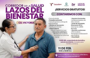 Asimismo, se brindará atención con aparatos funcionales, lentes graduados y para vista cansada, además de servicios y trámites como actas de nacimiento con descuento del 50%, inscripción al IMSS Bienestar, atención a peticiones, orientación del ITEA (Instituto Tamaulipeco de Educación para Adultos), módulo de esterilización de mascotas, área infantil, entre otros apoyos enfocados en el bienestar integral.