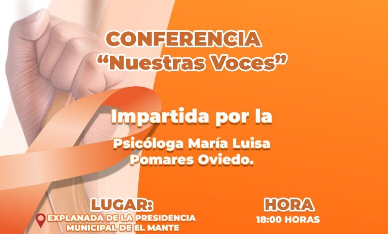 En coordinación con el Instituto Municipal de la Mujer que encabeza Martha Alonso, se llevará a cabo la conferencia “Nuestras Voces”, impartida por la psicóloga María Luisa Pomares Oviedo, como parte de las acciones impulsadas para conmemorar el Día Internacional de la Eliminación de la Violencia contra las Mujeres y las niñas.