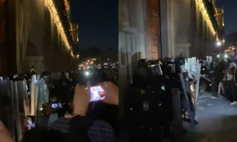 Encapuchados quitan vallas metálicas y golpean a policías en Palacio Nacional durante la jornada de Luto por Teuchitlán