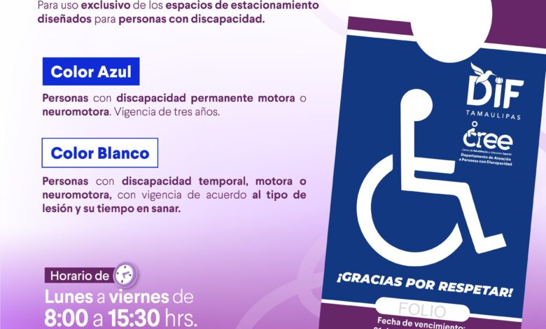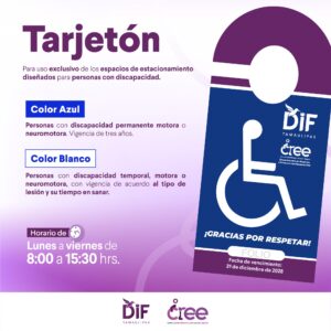Como parte de las acciones para promover la inclusión, el respeto y una movilidad más accesible, el Centro de Rehabilitación y Educación Especial (CREE) de Ciudad Victoria, a través del Departamento de Atención a Personas con Discapacidad, ofrece el trámite del tarjetón para el uso de espacios de estacionamiento exclusivos para personas con discapacidad permanente o temporal.