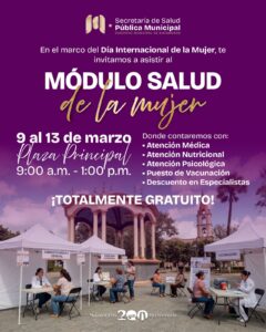 En el marco de las actividades conmemorativas por el Día Internacional de la Mujer, se estará llevando a cabo el Módulo Salud de la Mujer, una jornada pensada especialmente para acercar servicios de atención y acompañamiento que contribuyan al bienestar y cuidado de las mujeres.