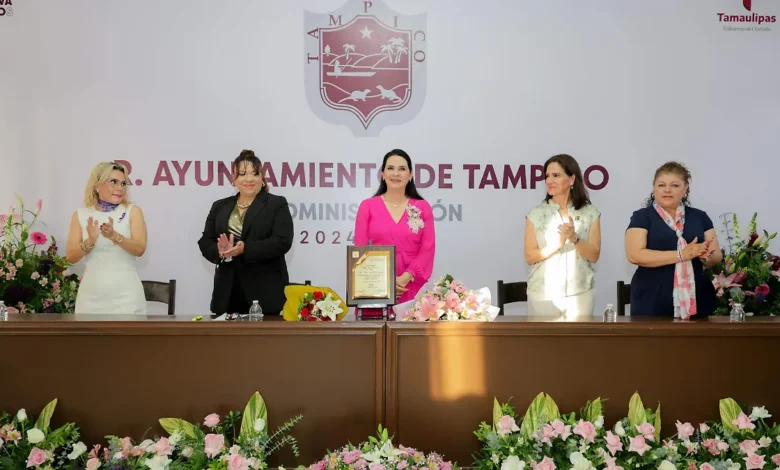 Fue en el marco del Día Internacional de la Mujer, que la Asociación de Mujeres Universitarias y Profesionales de Tampico, Ciudad Madero y Altamira, entregó el sábado 8 de marzo, la presea a la mandataria, en una ceremonia efectuada en la Sala del Cabildo.
