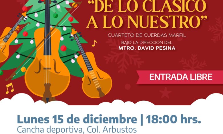 El evento se llevará a cabo el lunes 15 de diciembre en la cancha deportiva de la Colonia Arbustos, donde se presentará el Cuarteto de Cuerdas Marfil, bajo la dirección del Mtro. David Pesina.